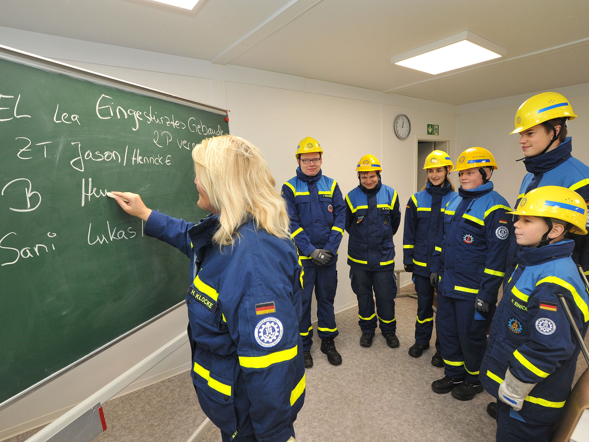 Bevor es an die Aufgabe ging, erklärte Heike Klocke noch die Strukturen für die Abarbeitung der Einsatzaufgabe: Welche Funktionen haben Zug-, Gruppen- und Truppführer? Welche Aufgaben hat der Zugtrupp? Wie erfolgt die Kommunikation? Welche Rettungs- und Hilfsmittel können zum Einsatz kommen? Wie bringen wir Licht ins Dunkel?