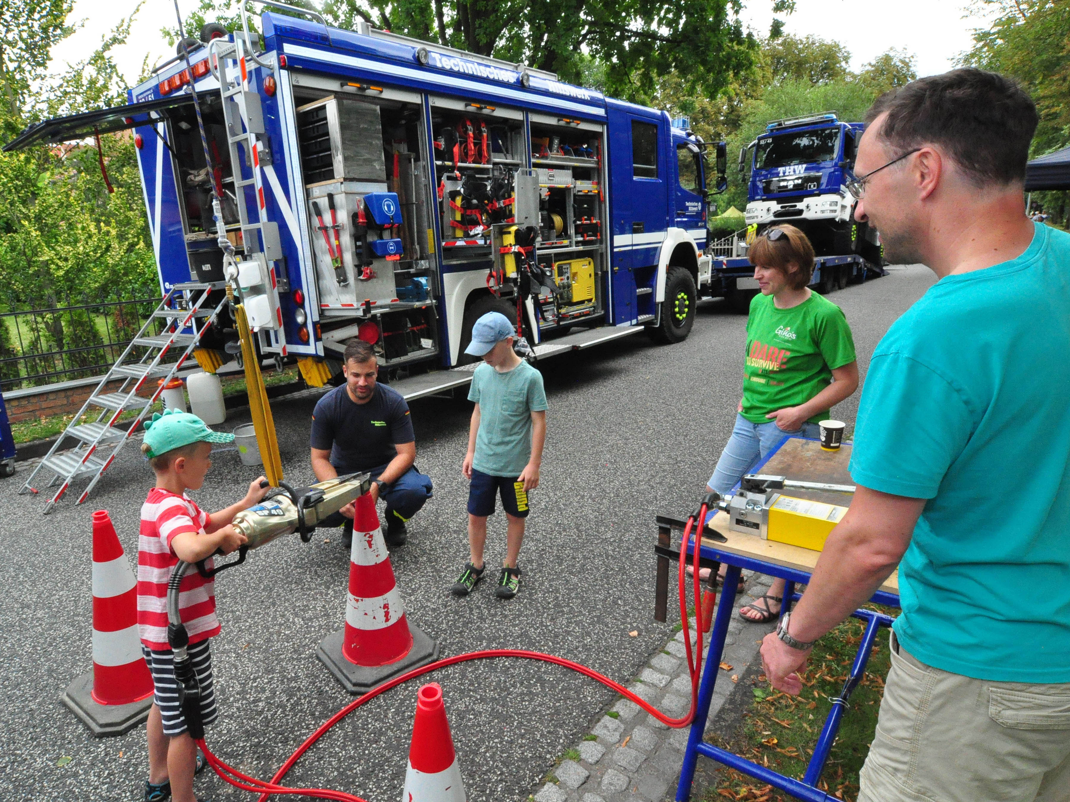 Der Ortsverband Eberswalde war zur „Blauen Meile“ umfangreich präsent: Die Fachgruppe Elektroversorgung lieferte unter der Regie von Lutz Lehniger den Strom für eine Vielzahl der Beteiligten, neugierig wurden die „Drohnen“ des Trupps „Unbemannte Luftfahrtsysteme“ bei André Hrdina und René Hoffmann bestaunt, Gert Fehrmann fuhr in Abwechslung mit Lutz Ahnert vom Ortsverband Seelow mit Besuchern zahllose Bootstouren mit dem THW-Boot. Auch das Pingpong-Spiel mit dem hydraulischen Spreizer, das William Pohl und Christian Richter vorbereitet hatten, stand gerade bei Familien hoch im Kurs. Und der Ortsbeauftragte Mirko Wolter nutzte die Gelegenheit, mit Interessenten oder auch mit langjährigen THW-Mitstreitern angeregte Gespräche zu führen.