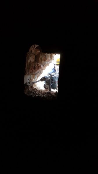 Währenddessen wurde draußen damit begonnen, einen weiteren Zugang zum Gebäude zu schaffen, über den Helfer und Material hinein und aufgefundene Personen samt Helfern hinaus gelangen könnten, ohne den Tunnel nutzen zu müssen, der für eine Personenbergung auch nicht geeignet gewesen wäre. Dazu wurde die etwa 60cm dicke Außenwand mit Aufbrechhammer und -meißel durchbrochen.