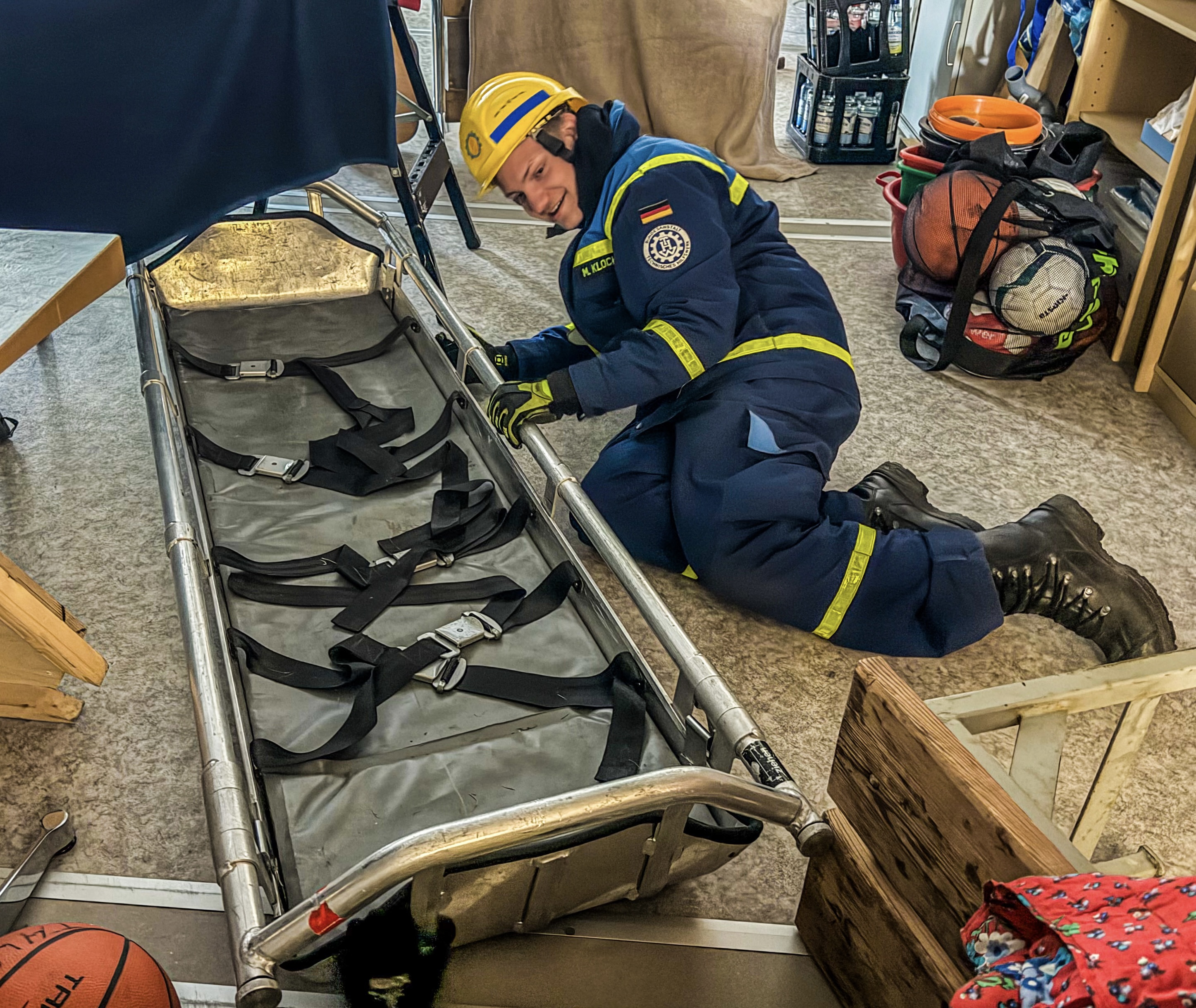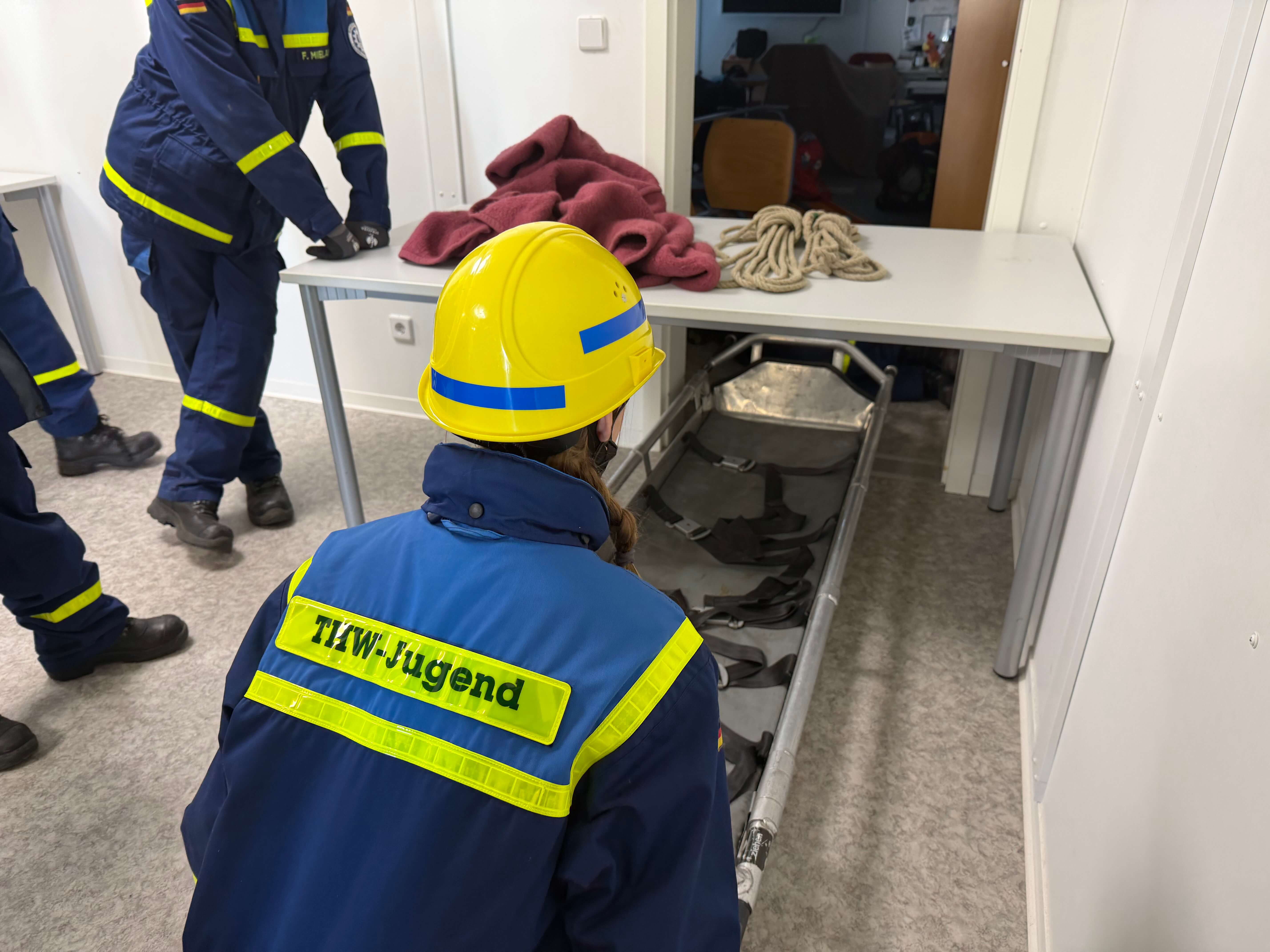 Am Vormittag wurde der Jugendraum in ein Trümmerszenario umgestaltet. In dieser realitätsnahen Umgebung übten die Jugendlichen die Rettung von Personen aus Trümmern. Dabei kam es nicht nur auf Teamarbeit und Geschicklichkeit an, sondern auch auf einen sicheren und überlegten Umgang mit den vorhandenen Mitteln.