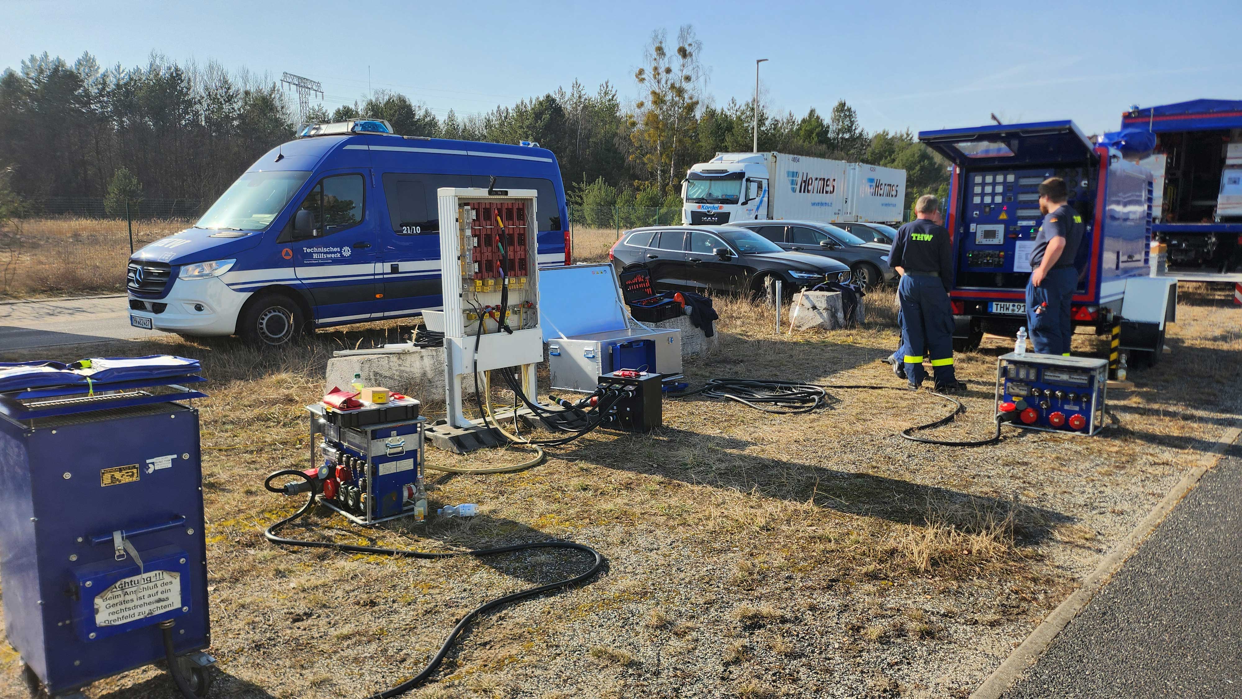 Die Fachgruppe Elektroversorgung musste etwas improvisieren, um das Einspeisen in ein Gebäude zu simulieren. Ein entsprechender Schaltschrank und ein Lastwiderstand mussten hierfür herhalten. Aber mit diesen kleinen Versuchsaufbau können tatsächlich Bedingungen geschaffen werden, wie sie bei Gebäuden häufig anzutreffen sind. Denn wie der Stromausfall in Berlin zeigte sind die wenigsten Gebäude mit entsprechenden Einspeisepunkten ausgestattet und deshalb ist es wichtig zu trainieren, wie dennoch richtig in Gebäude eingespeist werden kann. Hierzu wurde auch das neue 50 kVA-Aggregat der Fachgruppe N und die neuen Einspeisesätze verwenden.